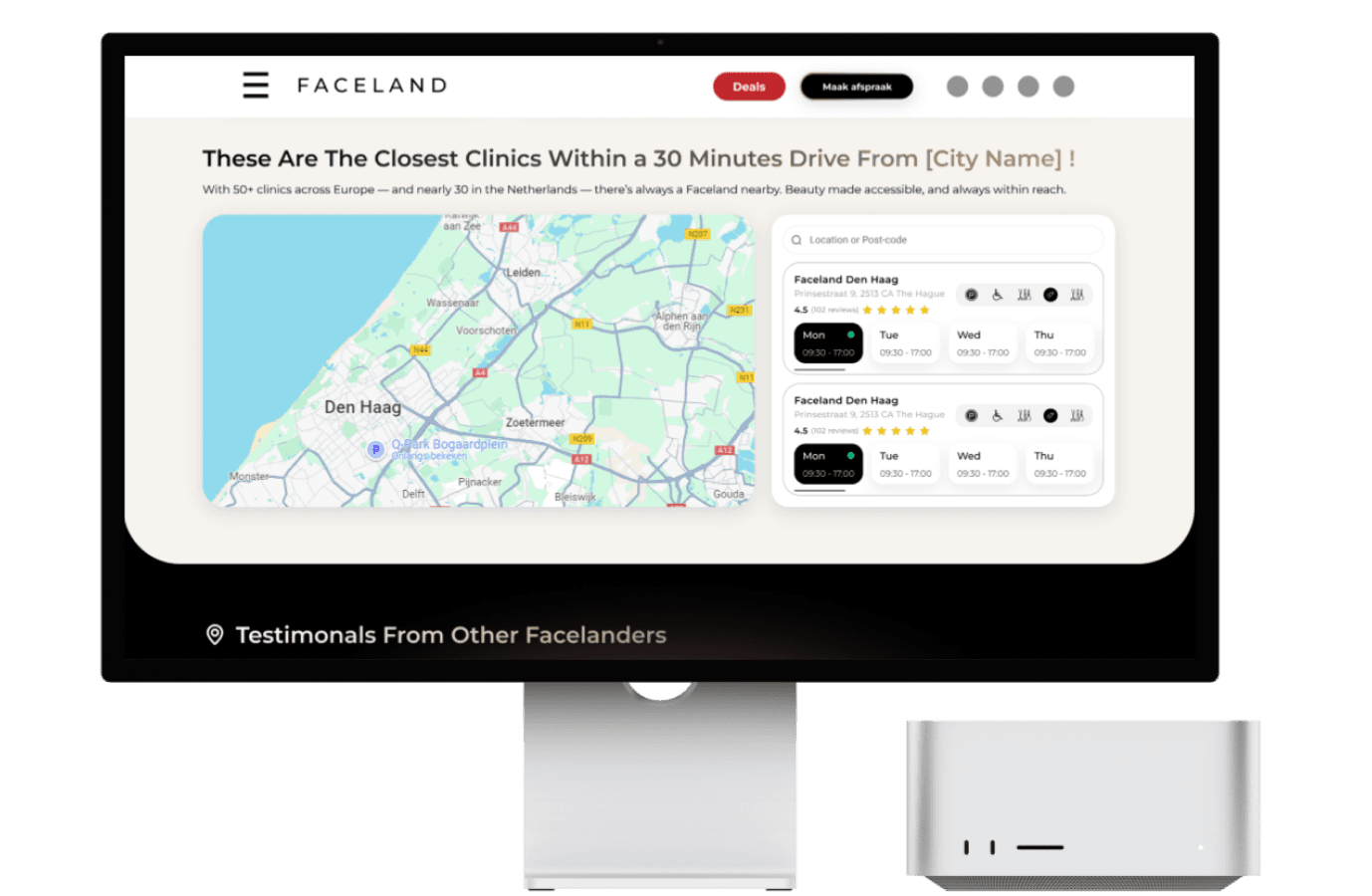I created a section that presents reviews, satisfaction scores, the Faceland specialist academy and a brand video. This part sits on a dark background to create a clear visual distinction. The white background represents essential content while the dark block represents proof and authority.